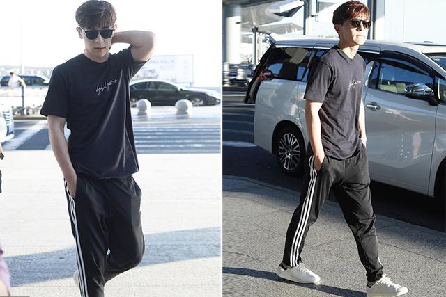 但是邓伦身上也不是没有亮点,阿迪运动裤的条纹边有一定的提亮整体的作用,不会因为太过简约而单调。小白鞋也是重点,如果这时候鞋也选择了黑色,就太暗沉了,没有阳光的感觉。