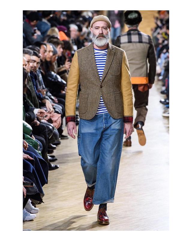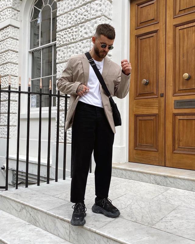 若想更为休闲化一些,还可以选择休闲的毛呢西服单品来搭配,裤子则是选择阔腿的深蓝牛仔裤单品,同是暗色的两件单品混搭起来同样不失沉稳属性,再选择一双休闲的时髦运动鞋来搭配并将裤脚挽起,整体效果也更显时髦、活力气息,让一身低调沉稳的暗色搭配同样不失玩味,这样的搭配更适用于一些“老炮”们。