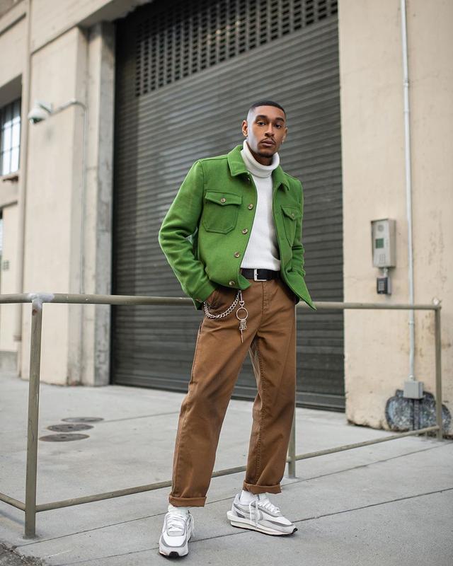 还可以感受不一样的复古搭配味道,除了牛仔夹克还可以选择藓绿夹克外套来搭配,与深卡其工装裤想成撞色对比效果,造型丰富有看点不少,而且罕见的复古夹克单品也让搭配更有新意,整体显复古意境韵味之余又不会暗沉无趣,同时还有白色高领毛衣作为提亮搭配,一身复古造型同样有活力看点。