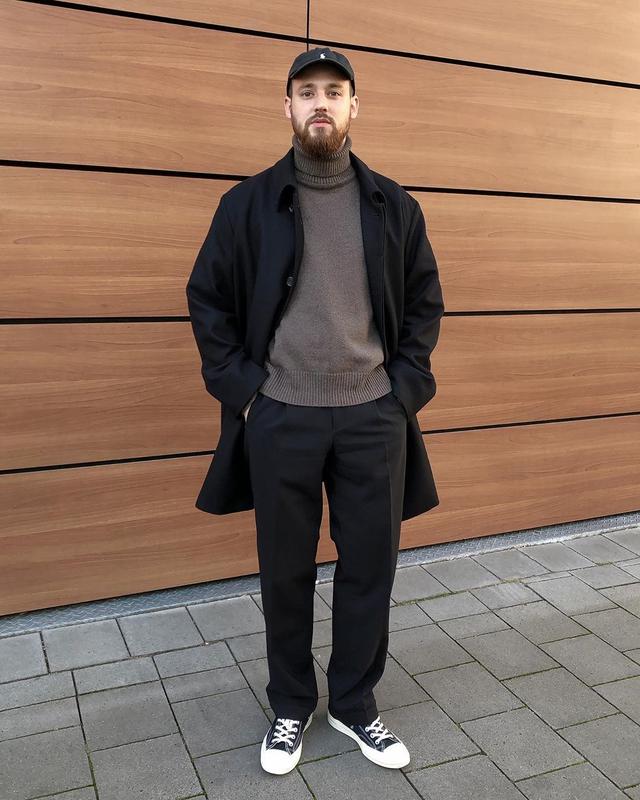 还可以选择偏暗色的大衣单品来搭配,与九分阔腿西裤搭配起来多出一丝正式的沉稳感,但有九分的阔腿裤与高领毛衣的衬托,搭配绅士有范但又不会太显正式无趣味,休闲简约又不失沉稳气息的一身搭配,可以作为日常的通勤搭配选择,冬天这么穿既可以穿梭于休闲的场合,同样可以用于上班的环境中,两全其美。