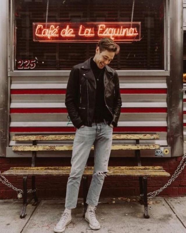 一条浅蓝色的洗水牛仔裤搭配短款的皮夹克,加上一双白色的帆布鞋,造型巧妙地搭配白色袜子,这样裤子、鞋子和袜子就是一个很好的整体,让双腿变得的更长,和上身形成撞色的效果造型就时髦出众。