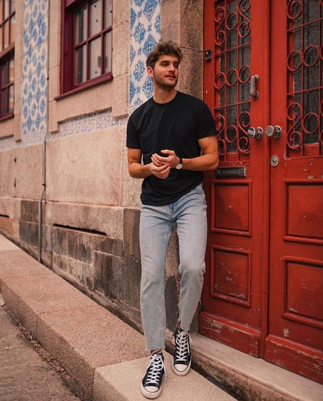 除了用牛仔九分裤搭配运动鞋打造潮流的风格,也可以搭配皮鞋打造一些沉稳时髦的造型。用一条黑色的牛仔裤打造沉稳的风格,在全黑的色调中,皮鞋和皮带都让造型显得更有层次感,造型能彰显出男人沉稳的魅力。