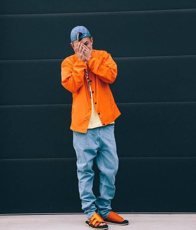 穿上橙色的外套,陈冠希呈现出来的感觉看上去更加具有大男孩气质,和喜欢追求潮流的男生没什么两样。橙色是一种看起来特别温暖的颜色,搭配蓝色的牛仔裤给人,满满的青春活力。帽子和鞋子的颜色分别对照衣服和裤子的颜色,这种呼应穿搭技巧值得学习。